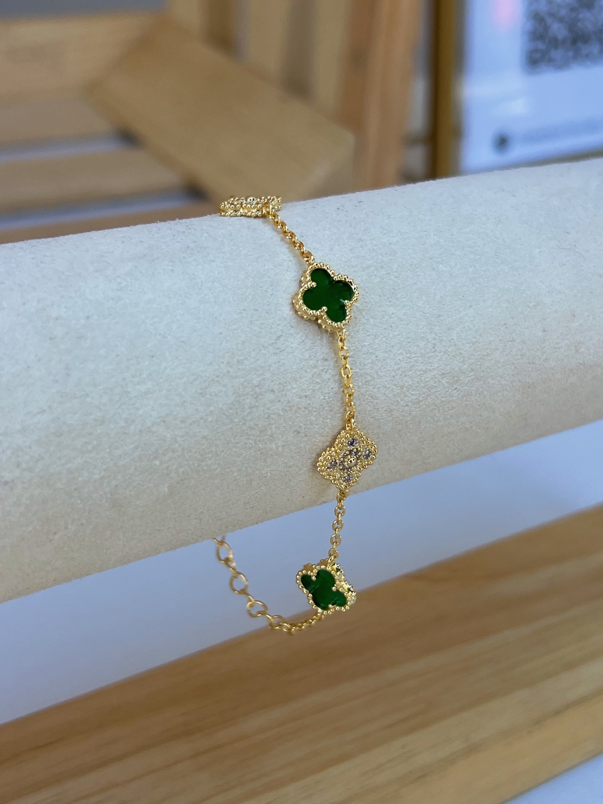 This stunning Green Flower Bracelet features a high-quality, 18k gold plated design that is non-tarnish. Enjoy the beauty and durability of this timeless piece as it adds a touch of elegance to any outfit. Perfect for those looking for a long-lasting, luxury accessory.